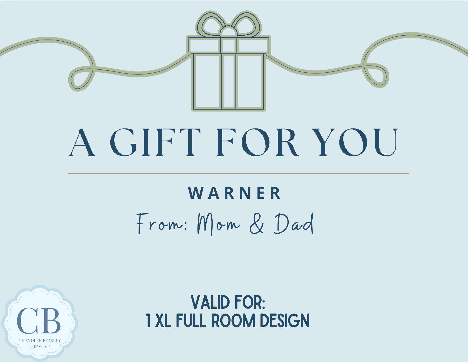 Not everyone has the funds or ability to prioritize making their house their home!! If you are looking for a gift thats a little more personal, this is a perfect option. Nothing is more personal than your home! After purchase, please email me at chandlerbeasley.creative@gmail.com so that we can get connected!! I will make to confirm gifting date/timeline so that I can follow up after the gift has been given to get connected to the recipient! If you would like to gift to multiple people, you can split your purchase between recipients!! I will email you a personalized digital gift card design that you can print or email to your recipient!